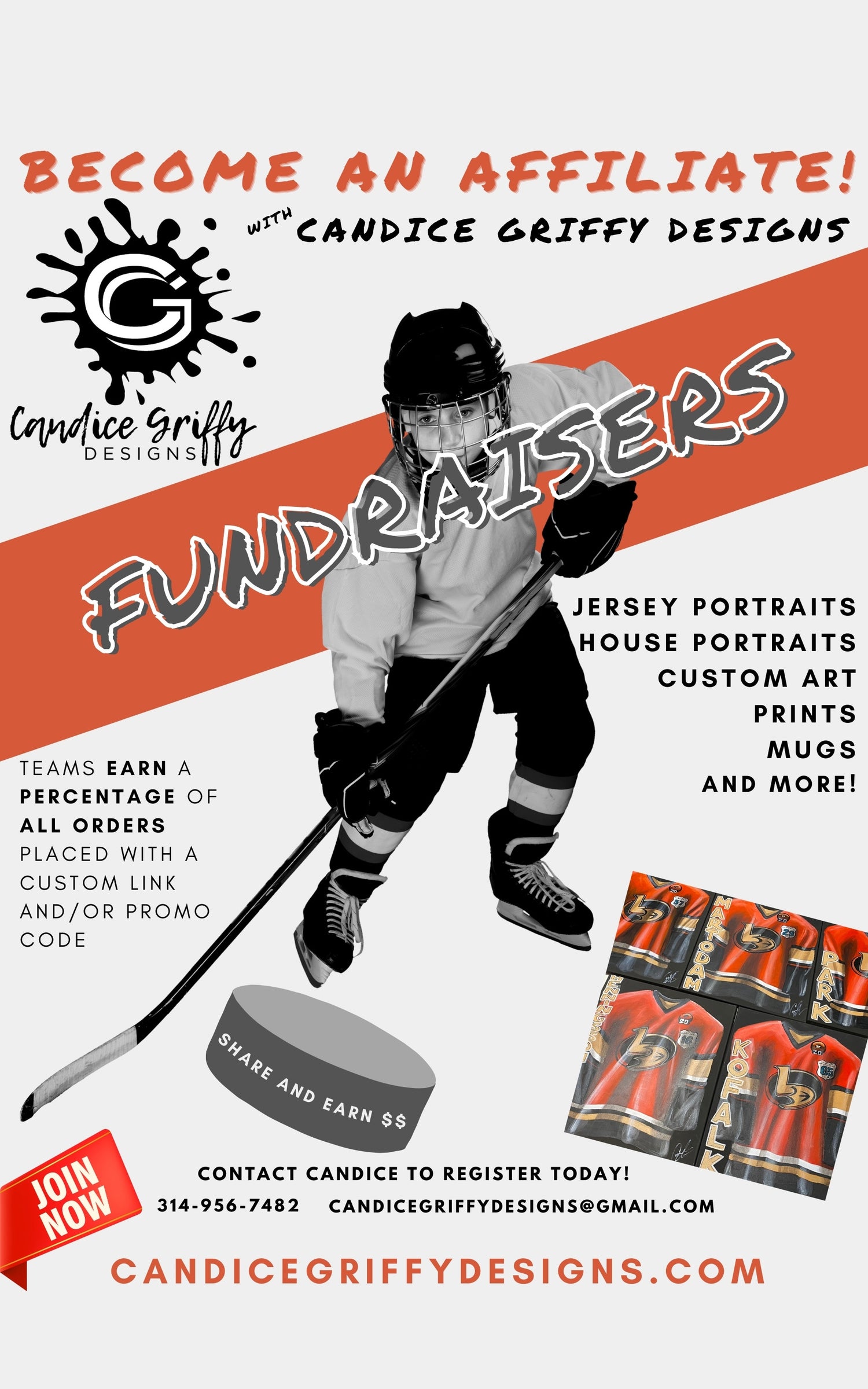 Is your youth sports team always looking for new ways to raise funds? Become an affiliate with me and start raising funds for your team! All orders placed through my website using a team specific link and/or code will generated funds for your team! Order jersey paintings, house portraits, custom art, and even gifts such as coffee mugs with my designs! There's minimal effort since there's no event to plan, minimal time dedicated, just register, receive a unique link and promo code just for your team and share on social media and with friends/family! It's that easy to start raising funds. In order to become and affiliate through my website you must register! Coaches and Team Leads Only, please.